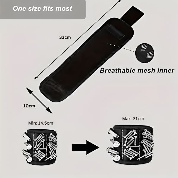 Grazie alle cinghie regolabili e traspiranti, questo braccialetto magnetico si adatta alla maggior parte delle dimensioni del polso, garantendo il comfort durante l’uso prolungato e mantenendo le mani libere.