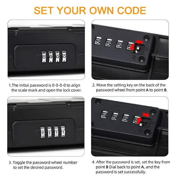 I vostri oggetti di valore sono al sicuro con la cassetta di sicurezza SAFORY, dotata di un codice a 4 cifre che offre fino a 10.000 combinazioni possibili, molto più sicuro dei tipici modelli a 3 cifre.
